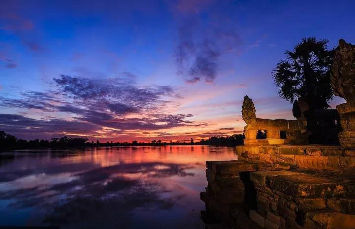 小吴哥日出和巴肯山日落是最不可错过的风景。吴哥寺平台前左侧的水池是最佳观赏地点,池中的红莲颇为繁盛。